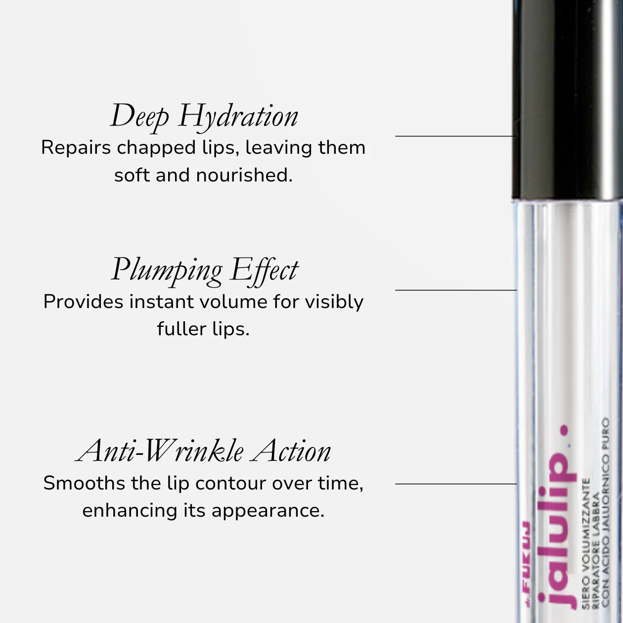 Con Acido Ialuronico Puro 0,7%, ripara e idrata le labbra screpolate, donando un effetto rimpolpante immediato. La sua azione antirughe distende il contorno labbra nel tempo. Texture leggera, assorbimento rapido, labbra morbide e nutrite.