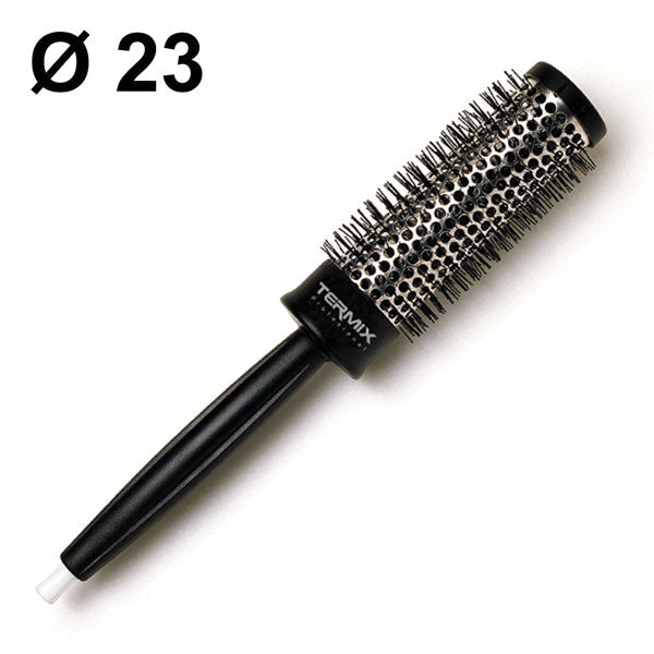 TERMIX EVOLUTION XL SPAZZOLA DIAM 23: Spazzola termica professionale in alluminio con setole in nylon, ideale per tutti i tipi di pettinature. Il suo cilindro rivestito in alluminio trattiene il calore più a lungo durante il processo di asciugatura per uno styling più veloce e migliore (riducendo il tempo di asciugatura del 50% rispetto ad altre spazzole in legno convenzionali). È disponibile in vari diametri a seconda della finitura desiderata e della quantità di capelli.